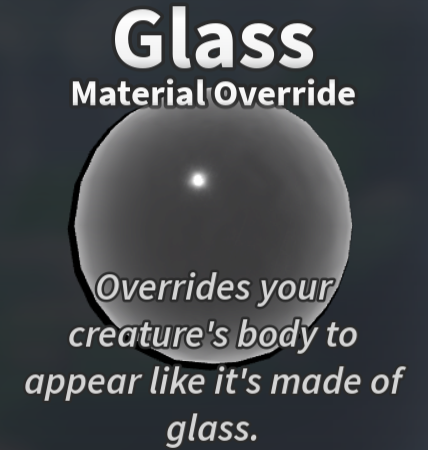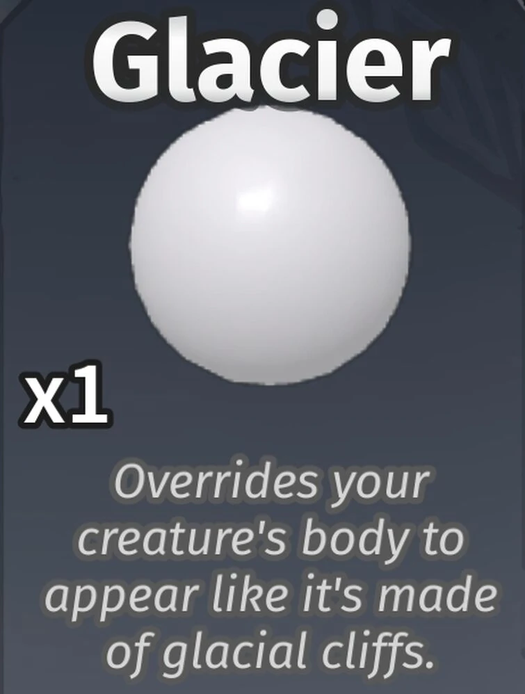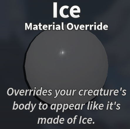 - ↑ As of September 13th, 2024, the Glacier Material Override was changed from its snow-like texture to a smoother texture. Mutations like Frostburn and creatures with this material were also affected. This was likely due to Roblox changing the material.