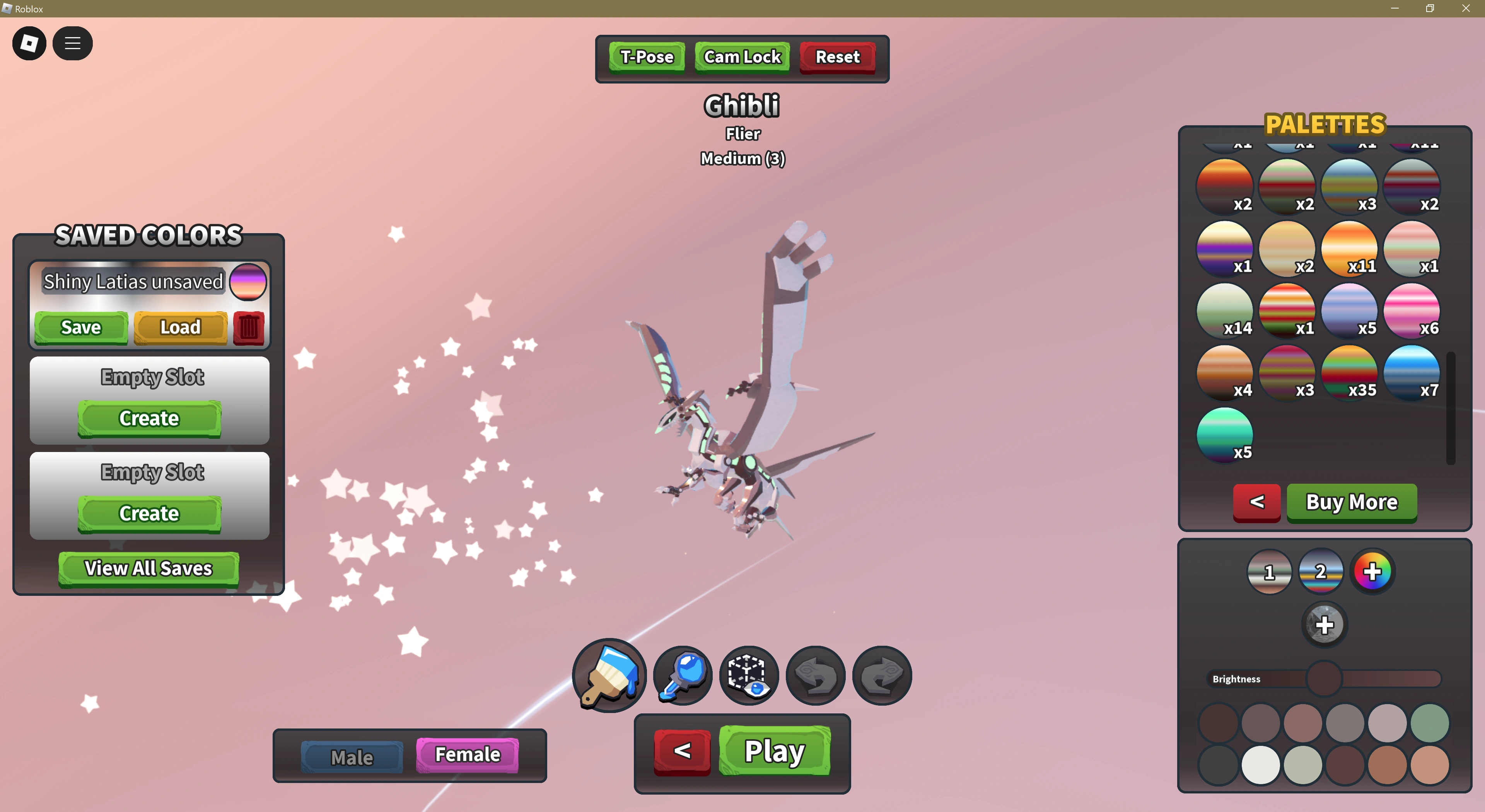 Players can open the Color Palettes shop either by creating a new stored creature and clicking on the multi-colored plus (+) symbol next to where the Main Palette/Secondary Palette preview is located, then clicking the "Buy More" button, or clicking the Shop button and navigating to the "Palettes" section. Same applies for Materials, except it's the rocky-themed plus (+) symbol, and leads to the "Materials" section of the shop.