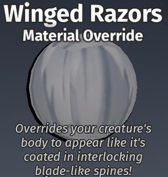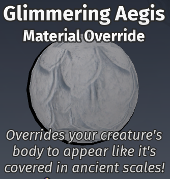 Material Overrides released on June 10th, 2022. They allow the user to change the texture of a stored creature slot, and are compatible with the Glimmer mutation. Most Material Overrides are not permanent, meaning you have to use an Appearance Change token to get them back when deleting a slot. Certain material overrides, such as Forcefield and the merchandise materials, do not require an Appearance Change token to retrieve. The player will be prompted when trying to delete a creature slot that has a material equipped, it will not delete your material override without warning.