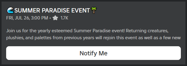 The Summer Paradise Event of 2024 is an event that released on July 26th, 2024, at 3:18 PM PDT, with a four-week duration, ending on August 23rd, 2024, at 3:02 PM PDT. This is the third returning Summer Paradise Event and will feature all previous Summer Paradise event creatures, plushies, and palettes, as well as some new unrevealed additions.